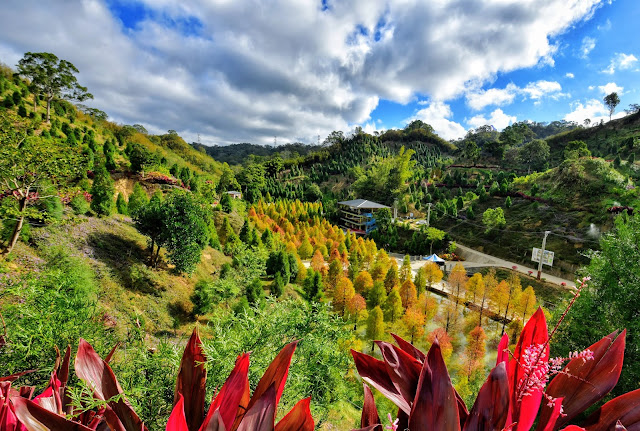 @落羽松莊園位處山谷中,五顏六色的落羽松與四周翠綠的山頭,鋪陳出如詩如畫絕美動人的畫面,美的有點不真實,不過這是實況事實⋯