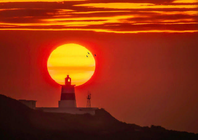 @NikonD500 18:27日落;小光圈最初f/35>f/22>最後f/11。最初1/800s>1/640s>最後1/250s。ISO400 恆定不變。200mm 18-400mm。上腳架。高速連拍。不用減光鏡。持續用AF對焦在燈塔上。追著落日跑。戴太陽眼鏡。新北市石門「富貴角燈塔」懸日。最後f/11 1/250s ISO400 。