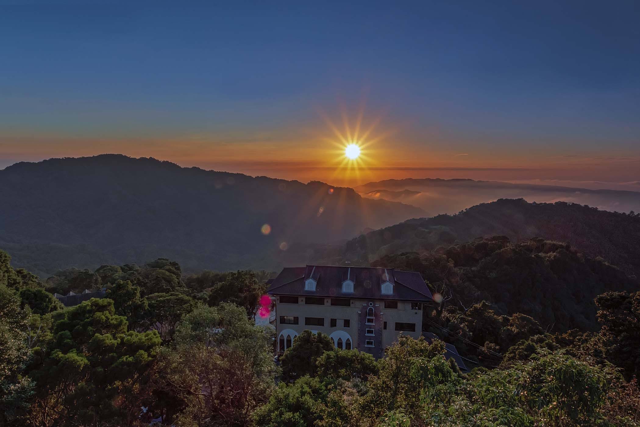 @在頂層王位旁的告示牌上當腳架,用魚眼鏡頭手持、包圍曝光、或1s內的慢速雲流也可~用魚眼鏡頭,山莊的面積就不會太大~